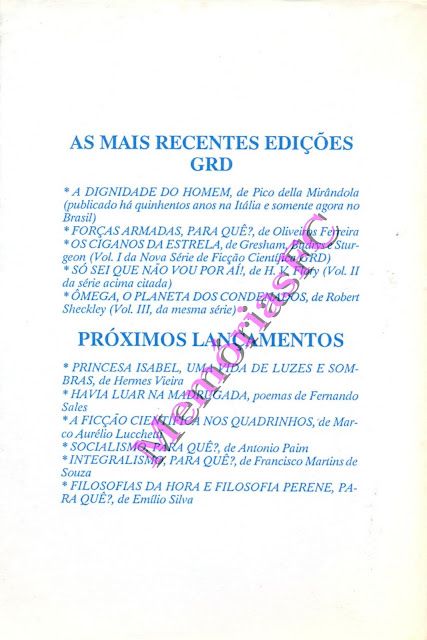 A ideia é ir aqui publicando todo o tipo de material (revistas, correspondência, livros, ilustrações, etc.) que ao longo dos anos fui guardando e que constituem as minhas memórias desde os 12 anos com a ficção científica, fantasia e horror. Foi nesse longínquo ano de 1972 que tive o primeiro contacto com o género através do livro do Poul Anderson, O Planeta dos Homens Alados, publicado na extinta Argonauta. Pretendo assim que não caia no esquecimento muito do que por cá e lá fora se passou.